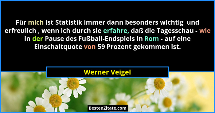 Für mich ist Statistik immer dann besonders wichtig und erfreulich , wenn ich durch sie erfahre, daß die Tagesschau - wie in der Pause des Fußball-Endspiels in Rom - auf eine Einschaltquote von 59 Prozent gekommen ist.
