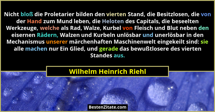 Nicht bloß die Proletarier bilden den vierten Stand, die Besitzlosen, die von der Hand zum Mund leben, die Heloten des Capitals, die beseelten Werkzeuge, welche als Rad, Walze, Kurbel von Fleisch und Blut neben den eisernen Rädern, Walzen und Kurbeln unlösbar und unerlösbar in den Mechanismus unserer märchenhaften Maschinenwelt eingekeilt sind: sie alle machen nur Ein Glied, und gerade das bewußtlosere des vierten Standes aus.