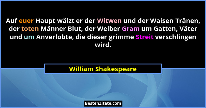 Auf euer Haupt wälzt er der Witwen und der Waisen Tränen, der toten Männer Blut, der Weiber Gram um Gatten, Väter und um Anverlobte, die dieser grimme Streit verschlingen wird.