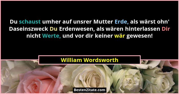 Du schaust umher auf unsrer Mutter Erde, als wärst ohn' Daseinszweck Du Erdenwesen, als wären hinterlassen Dir nicht Werte, und vor dir keiner wär gewesen!