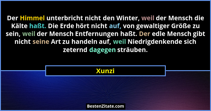Der Himmel unterbricht nicht den Winter, weil der Mensch die Kälte haßt. Die Erde hört nicht auf, von gewaltiger Größe zu sein, weil der Mensch Entfernungen haßt. Der edle Mensch gibt nicht seine Art zu handeln auf, weil Niedrigdenkende sich zeternd dagegen sträuben.