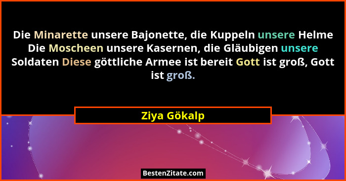 Die Minarette unsere Bajonette, die Kuppeln unsere Helme Die Moscheen unsere Kasernen, die Gläubigen unsere Soldaten Diese göttliche Armee ist bereit Gott ist groß, Gott ist groß.