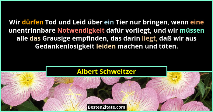 Wir dürfen Tod und Leid über ein Tier nur bringen, wenn eine unentrinnbare Notwendigkeit dafür vorliegt, und wir müssen alle das Grausige empfinden, das darin liegt, daß wir aus Gedankenlosigkeit leiden machen und töten.