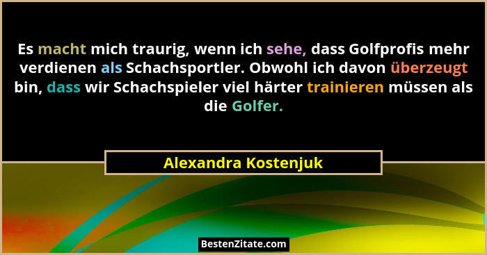 Es macht mich traurig, wenn ich sehe, dass Golfprofis mehr verdienen als Schachsportler. Obwohl ich davon überzeugt bin, dass wir Schachspieler viel härter trainieren müssen als die Golfer.