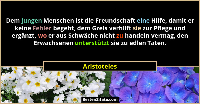 Dem jungen Menschen ist die Freundschaft eine Hilfe, damit er keine Fehler begeht, dem Greis verhilft sie zur Pflege und ergänzt, wo er aus Schwäche nicht zu handeln vermag, den Erwachsenen unterstützt sie zu edlen Taten.