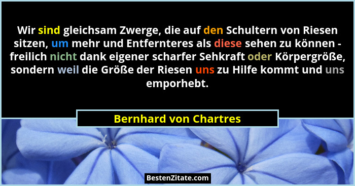 Wir sind gleichsam Zwerge, die auf den Schultern von Riesen sitzen, um mehr und Entfernteres als diese sehen zu können - freilich nicht dank eigener scharfer Sehkraft oder Körpergröße, sondern weil die Größe der Riesen uns zu Hilfe kommt und uns emporhebt.
