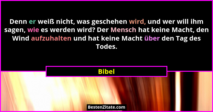 Denn er weiß nicht, was geschehen wird, und wer will ihm sagen, wie es werden wird? Der Mensch hat keine Macht, den Wind aufzuhalten und hat keine Macht über den Tag des Todes.