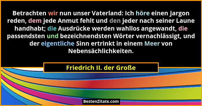 Betrachten wir nun unser Vaterland: Ich höre einen Jargon reden, dem jede Anmut fehlt und den jeder nach seiner Laune handhabt; die Ausdrücke werden wahllos angewandt, die passendsten und bezeichnendsten Wörter vernachlässigt, und der eigentliche Sinn ertrinkt in einem Meer von Nebensächlichkeiten.