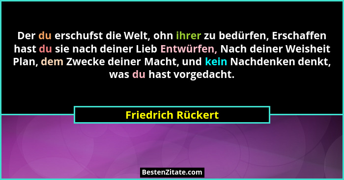 Der du erschufst die Welt, ohn ihrer zu bedürfen, Erschaffen hast du sie nach deiner Lieb Entwürfen, Nach deiner Weisheit Plan, dem Zwecke deiner Macht, und kein Nachdenken denkt, was du hast vorgedacht.