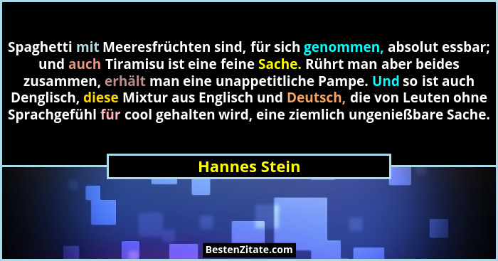 Spaghetti mit Meeresfrüchten sind, für sich genommen, absolut essbar; und auch Tiramisu ist eine feine Sache. Rührt man aber beides zusammen, erhält man eine unappetitliche Pampe. Und so ist auch Denglisch, diese Mixtur aus Englisch und Deutsch, die von Leuten ohne Sprachgefühl für cool gehalten wird, eine ziemlich ungenießbare Sache.