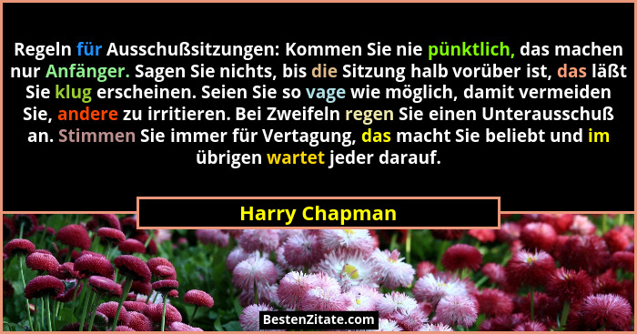 Regeln für Ausschußsitzungen: Kommen Sie nie pünktlich, das machen nur Anfänger. Sagen Sie nichts, bis die Sitzung halb vorüber ist, das läßt Sie klug erscheinen. Seien Sie so vage wie möglich, damit vermeiden Sie, andere zu irritieren. Bei Zweifeln regen Sie einen Unterausschuß an. Stimmen Sie immer für Vertagung, das macht Sie beliebt und im übrigen wartet jeder darauf.