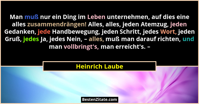 Man muß nur ein Ding im Leben unternehmen, auf dies eine alles zusammendrängen! Alles, alles, jeden Atemzug, jeden Gedanken, jede Handbewegung, jeden Schritt, jedes Wort, jeden Gruß, jedes Ja, jedes Nein, – alles, muß man darauf richten, und man vollbringt's, man erreicht's. –