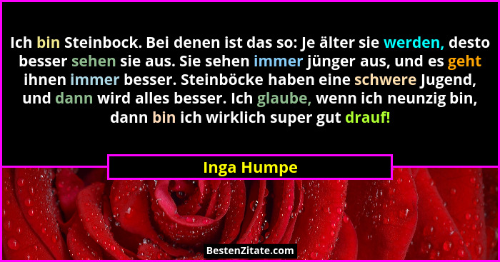 Ich bin Steinbock. Bei denen ist das so: Je älter sie werden, desto besser sehen sie aus. Sie sehen immer jünger aus, und es geht ihnen immer besser. Steinböcke haben eine schwere Jugend, und dann wird alles besser. Ich glaube, wenn ich neunzig bin, dann bin ich wirklich super gut drauf!