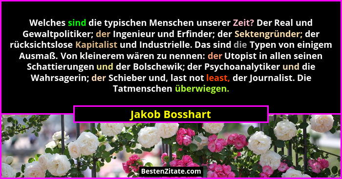 Welches sind die typischen Menschen unserer Zeit? Der Real und Gewaltpolitiker; der Ingenieur und Erfinder; der Sektengründer; der rücksichtslose Kapitalist und Industrielle. Das sind die Typen von einigem Ausmaß. Von kleinerem wären zu nennen: der Utopist in allen seinen Schattierungen und der Bolschewik; der Psychoanalytiker und die Wahrsagerin; der Schieber und, last not least, der Journalist. Die Tatmenschen überwiegen.