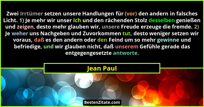 Zwei Irrtümer setzen unsere Handlungen für (vor) den andern in falsches Licht. 1) Je mehr wir unser Ich und den rächenden Stolz desselben genießen und zeigen, desto mehr glauben wir, unsere Freude erzeuge die fremde. 2) Je weher uns Nachgeben und Zuvorkommen tut, desto weniger setzen wir voraus, daß es den andern oder den Feind um so mehr gewinne und befriedige, und wir glauben nicht, daß unserem Gefühle gerade das entgegengesetzte antworte.