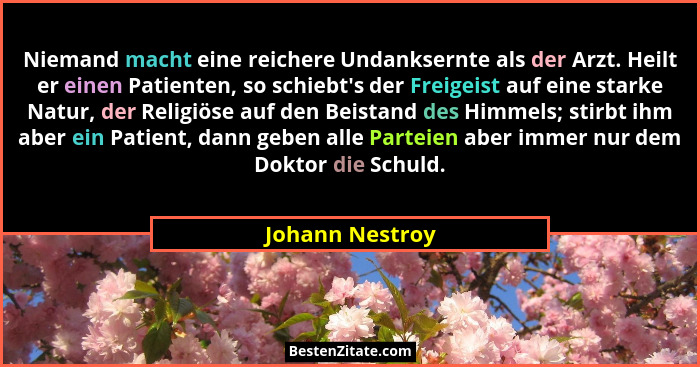 Niemand macht eine reichere Undanksernte als der Arzt. Heilt er einen Patienten, so schiebt's der Freigeist auf eine starke Natur, der Religiöse auf den Beistand des Himmels; stirbt ihm aber ein Patient, dann geben alle Parteien aber immer nur dem Doktor die Schuld.