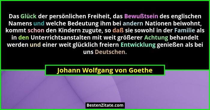 Das Glück der persönlichen Freiheit, das Bewußtsein des englischen Namens und welche Bedeutung ihm bei andern Nationen beiwohnt, kommt schon den Kindern zugute, so daß sie sowohl in der Familie als in den Unterrichtsanstalten mit weit größerer Achtung behandelt werden und einer weit glücklich freiern Entwicklung genießen als bei uns Deutschen.