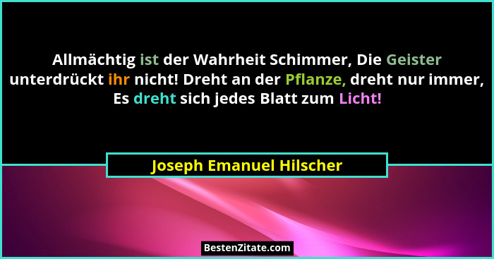 Allmächtig ist der Wahrheit Schimmer, Die Geister unterdrückt ihr nicht! Dreht an der Pflanze, dreht nur immer, Es dreht sich jedes Blatt zum Licht!