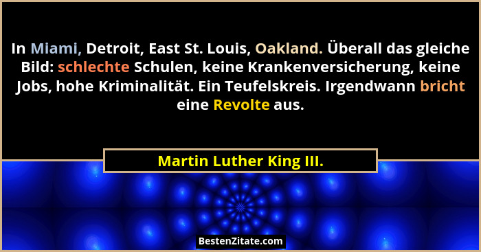 In Miami, Detroit, East St. Louis, Oakland. Überall das gleiche Bild: schlechte Schulen, keine Krankenversicherung, keine Jobs, hohe Kriminalität. Ein Teufelskreis. Irgendwann bricht eine Revolte aus.