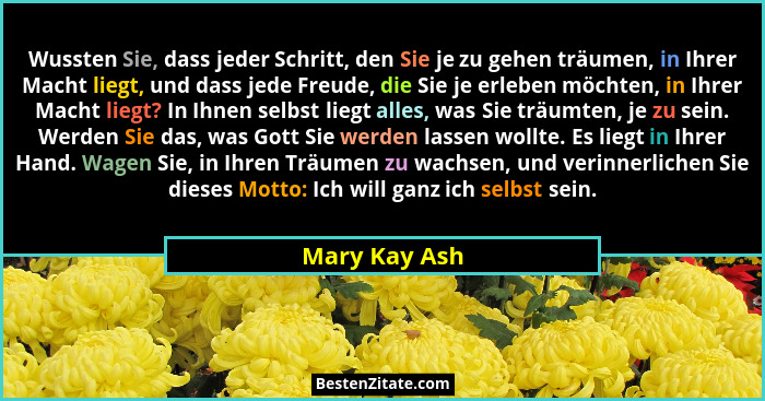 Wussten Sie, dass jeder Schritt, den Sie je zu gehen träumen, in Ihrer Macht liegt, und dass jede Freude, die Sie je erleben möchten, in Ihrer Macht liegt? In Ihnen selbst liegt alles, was Sie träumten, je zu sein. Werden Sie das, was Gott Sie werden lassen wollte. Es liegt in Ihrer Hand. Wagen Sie, in Ihren Träumen zu wachsen, und verinnerlichen Sie dieses Motto: Ich will ganz ich selbst sein.