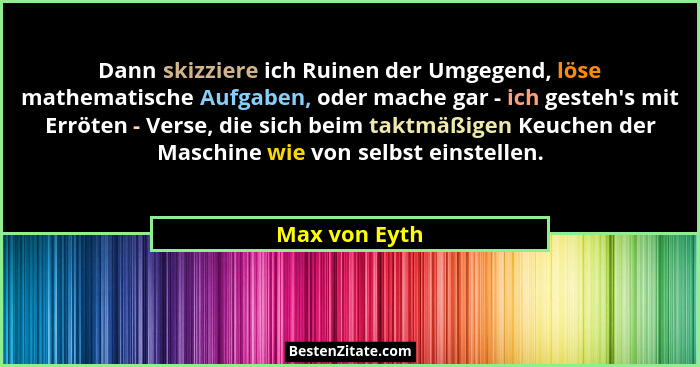 Dann skizziere ich Ruinen der Umgegend, löse mathematische Aufgaben, oder mache gar - ich gesteh's mit Erröten - Verse, die sich beim taktmäßigen Keuchen der Maschine wie von selbst einstellen.