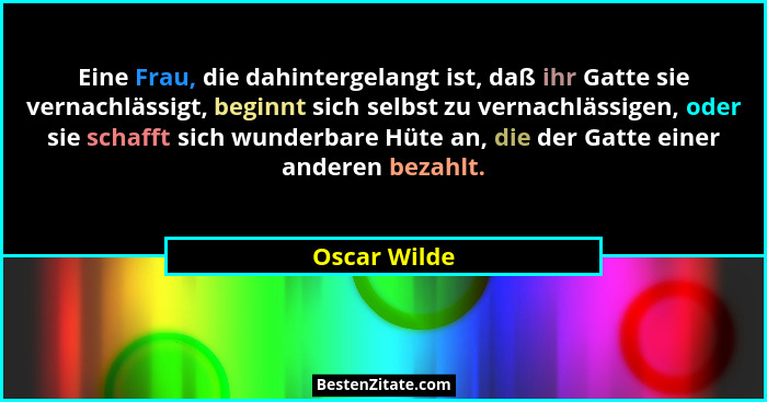 Eine Frau, die dahintergelangt ist, daß ihr Gatte sie vernachlässigt, beginnt sich selbst zu vernachlässigen, oder sie schafft sich wunderbare Hüte an, die der Gatte einer anderen bezahlt.