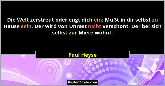 Die Welt zerstreut oder engt dich ein; Mußt in dir selbst zu Hause sein. Der wird von Unrast nicht verschont, Der bei sich selbst zur Miete wohnt.