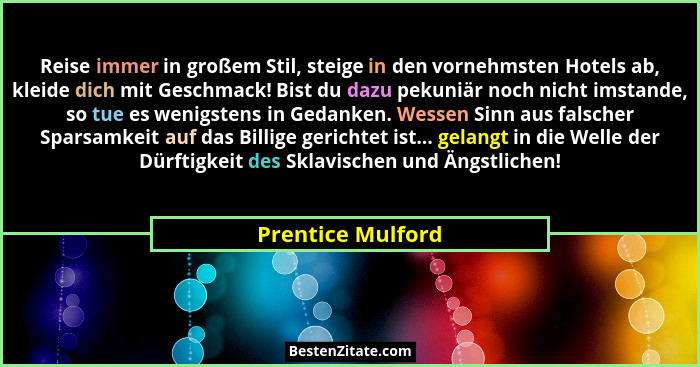 Reise immer in großem Stil, steige in den vornehmsten Hotels ab, kleide dich mit Geschmack! Bist du dazu pekuniär noch nicht imstande, so tue es wenigstens in Gedanken. Wessen Sinn aus falscher Sparsamkeit auf das Billige gerichtet ist... gelangt in die Welle der Dürftigkeit des Sklavischen und Ängstlichen!