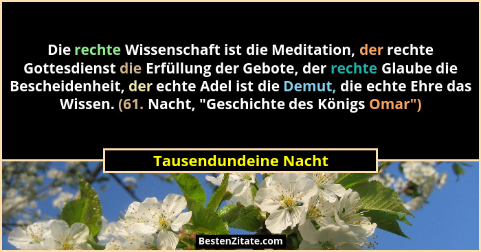 Die rechte Wissenschaft ist die Meditation, der rechte Gottesdienst die Erfüllung der Gebote, der rechte Glaube die Bescheidenheit, der echte Adel ist die Demut, die echte Ehre das Wissen. (61. Nacht, "Geschichte des Königs Omar")